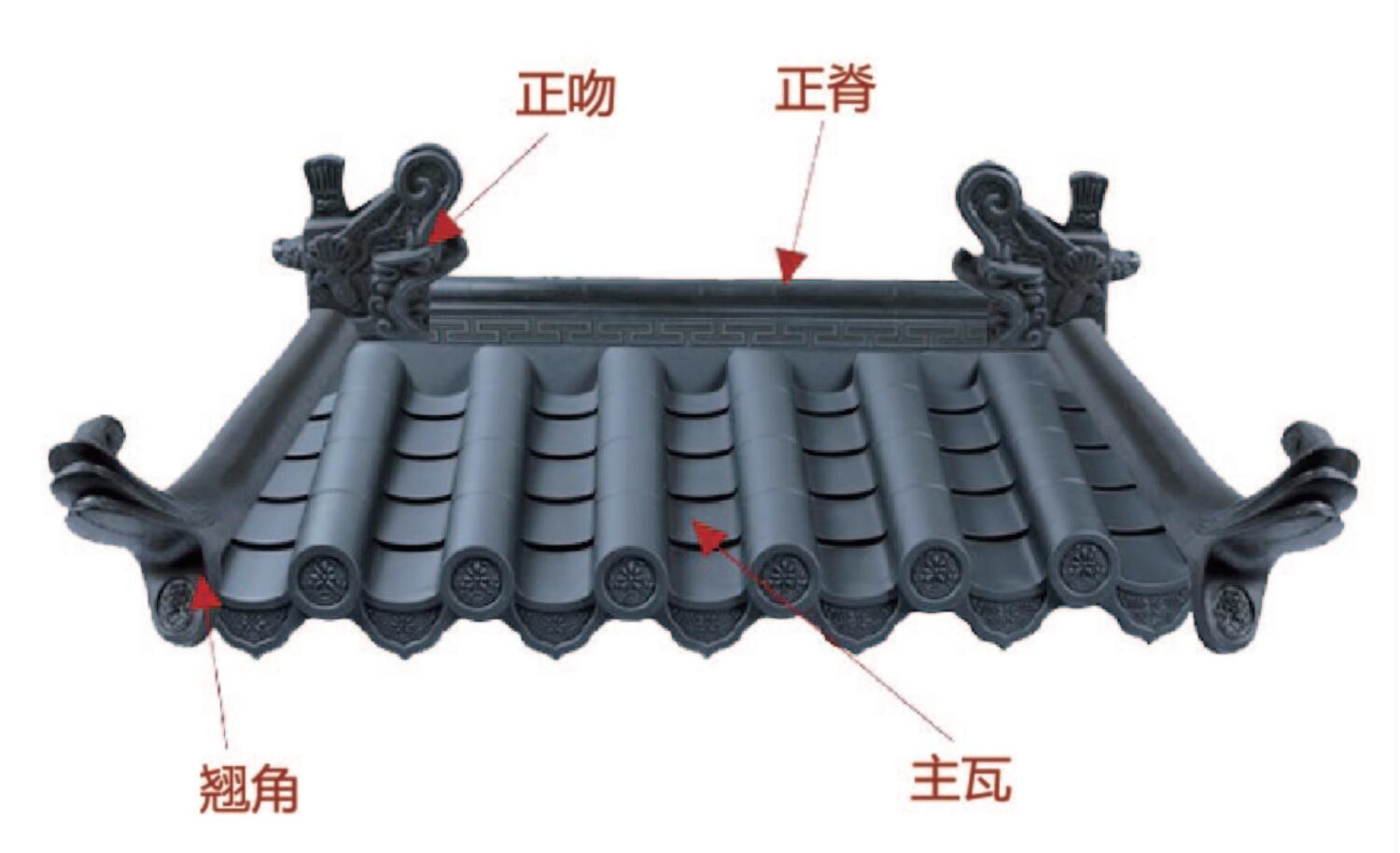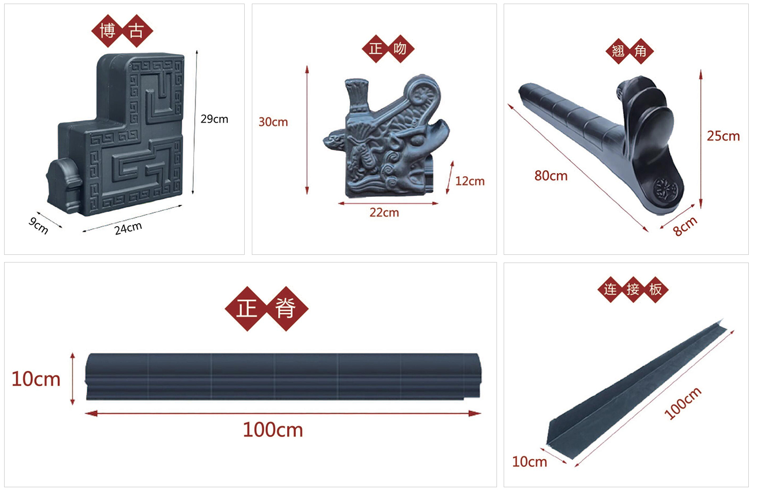 上段、中段、下段下端、正吻博古祥云翹、鳳尾翹祥云正脊、普通正脊連接板